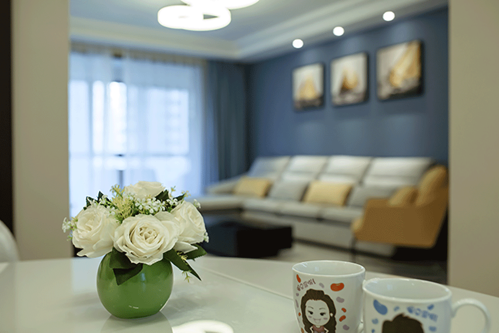 浪漫婚房,清净的湖水蓝撞色温暖的柠檬黄